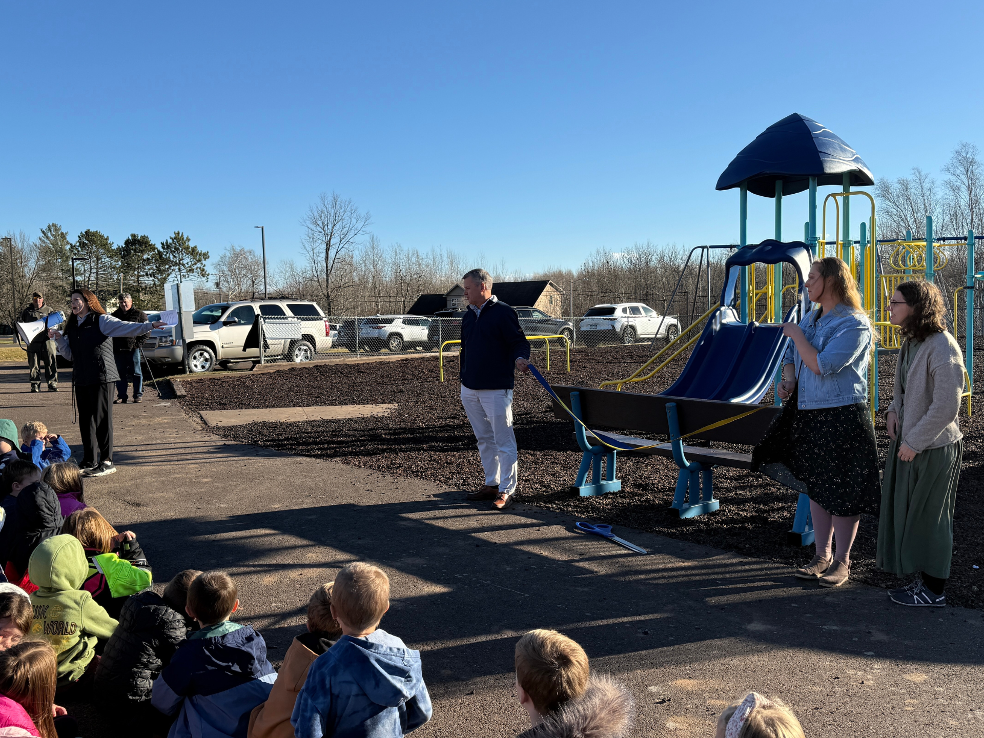 The Hermantown Elementary Playground officially opened on Wednesday, Nov. 5 with a ribbon-cutting ceremony with Principal Appelwick, Superintendent Whitwam and members of the Hermantown PTO. All elementary students and staff were in attendance, which made the ceremony extra special and extra fun!